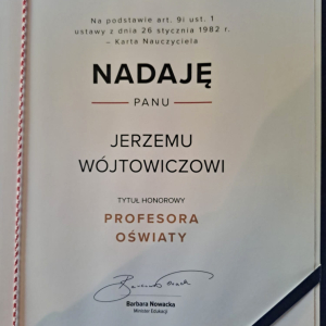 Nauczyciel naszej szkoły, pan Jerzy Wójtowicz został uhonorowany najwyższym odznaczeniem w polskiej edukacji – tytułem Honorowego Profesora Oświaty, nadawanym przez Ministra Edukacji Narodowej.